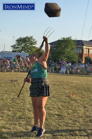 Jessica Bridenthal broke the world record for the 10-lb. sheaf over bar, as part of her overall victory in the women’s class. IronMind® | IHGF photo