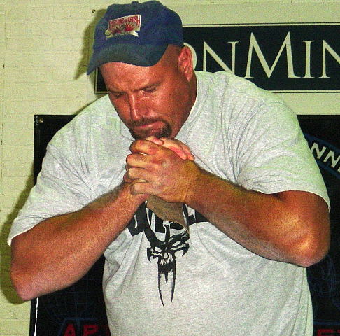 Dave Morton, the first man in the world to be certified on both the No. 4 Captains of Crush® gripper and the IronMind® Red Nail™, bends a cut Red Nail at the 2004 Global Grip Challenge, put on by the Diesel Crew. IronMind® | Photo courtesy of James Smith.